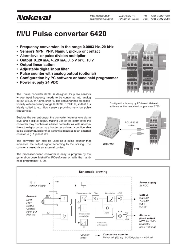 脈沖轉(zhuǎn)換器6420設(shè)計用于需要將輸入頻率轉(zhuǎn)換為0/4...20 mA或0...5/10 V模擬輸出的脈沖傳感器,該轉(zhuǎn)換器的頻率范圍非常寬,為0.0003 Hz...20 kHz,因此非常適合提供非常低脈沖頻率的流量傳感器。 除了電流輸出,轉(zhuǎn)換器還具有一個報警電平和一個數(shù)字輸出。利用報警電平,轉(zhuǎn)換器也可以作為一個批處理控制器來使用。另外,數(shù)字輸出可以作為一個內(nèi)部可配置的脈沖分壓器/乘法器,將脈沖傳輸?shù)酵獠坑嫈?shù)器,例如1個脈沖/升。 轉(zhuǎn)換器也可以作為脈沖計數(shù)器,根據(jù)縮放增加輸出信號。計數(shù)器通過一個外部觸點進(jìn)行復(fù)位。 基于處理器的轉(zhuǎn)換器很容易通過通用的MekuWin PC軟件或手持式編程器6790進(jìn)行編程。