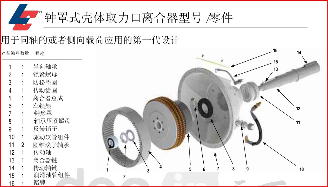 Logan氣/液驅(qū)動(dòng) 鐘罩式殼體取力口離合器式自調(diào)節(jié)的,設(shè)計(jì)成直接安裝到柴油發(fā)動(dòng)機(jī)或者汽油發(fā)動(dòng)機(jī)的飛輪上。摩擦圓盤組為干式應(yīng)用設(shè)計(jì)。通過一個(gè)固定的缸套-活塞布置或者通過內(nèi)置軸和離合器油道來完成。離合器的傳動(dòng)軸通過內(nèi)孔或鍵槽來安裝。扭矩從盤片組傳遞到安裝在發(fā)動(dòng)機(jī)飛輪上的齒輪傳動(dòng)齒圈上。Logan離合器主杠加壓, 推動(dòng)活塞夾緊或鎖住摩擦片或分離鋼片。當(dāng)壓力移走, 回位彈簧使摩擦片和鋼片分離, 當(dāng)鋼片和摩擦片分離后, 可以保持運(yùn)行間隙。